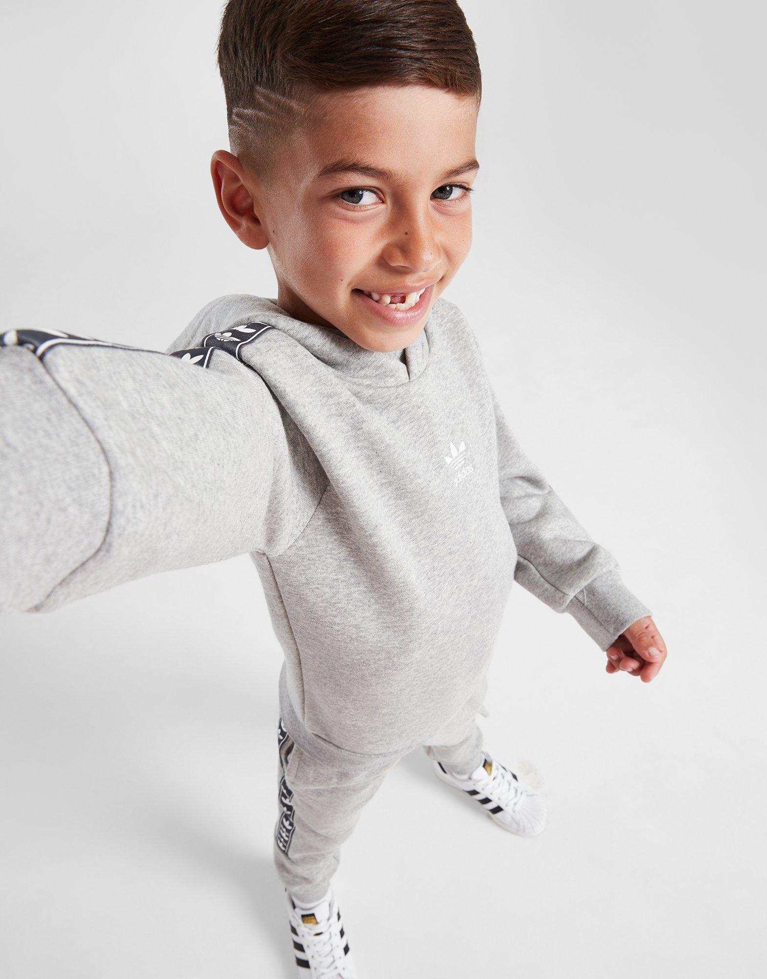 Mit diesem Tape Cargo-Trainingsanzug für Kinder von adidas Originals zeigst du dir einen straßentauglichen Style. Dieser exklusiv bei JD erhältliche Anzug mit normaler Passform ist aus einem superweichen Mischgewebe aus Baumwolle und recyceltem Polyester gefertigt, um ein angenehmes Tragegefühl zu gewährleisten. Es ist in der Farbe Grau gehalten und verfügt über einen Kapuzenpullover zum Überziehen mit fester Kapuze und gerippten Abschlüssen. Die passenden Jogginghosen haben einen elastischen Bund für ein bequemes Tragegefühl, Bündchen an den Knöcheln für eine bessere Passform und Seitentaschen für schnelles Verstauen. Mit einer Cargotasche für einen praktischen Touch und durchgehendem Trefoil-Logo. Waschmaschinenfest. | IQ4703