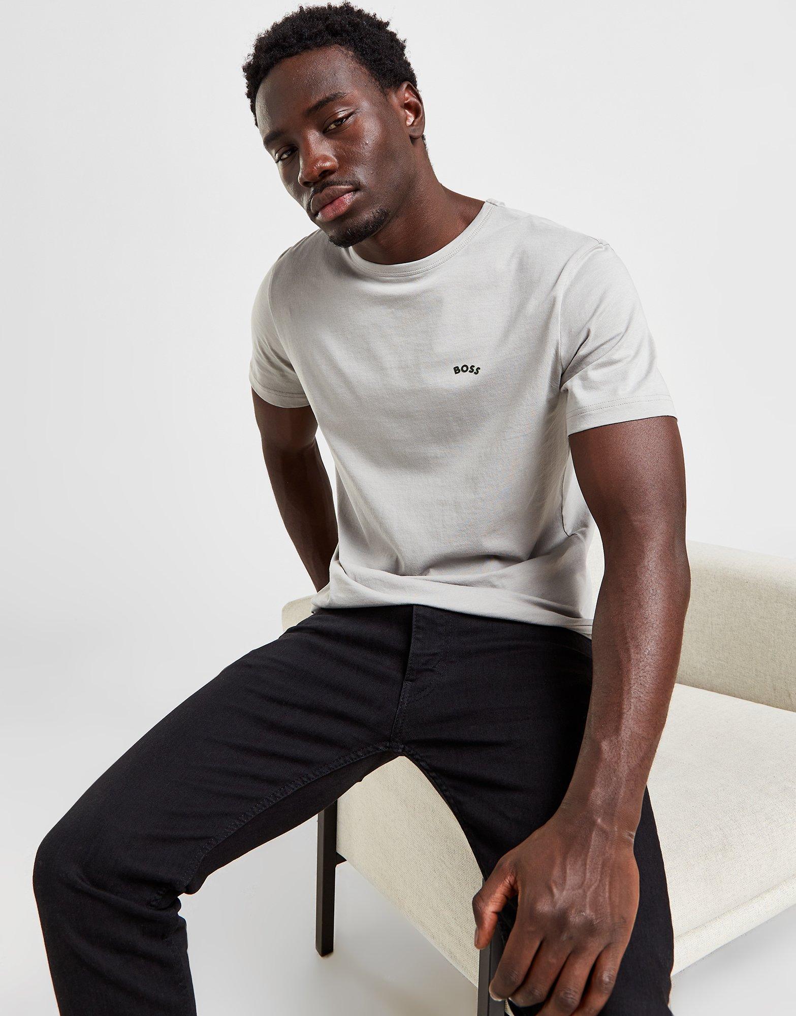 Upgrade deine Garderobe mit Curved Logo Herren-T-Shirt von BOSS. Dieses JD-exklusive Standard-Fit Oberteil ist in Grau gehalten und besteht aus weichem Baumwollstoff, um dir absoluten Komfort zu bieten. Es verfügt über kurze Ärmel, einen gerippten Rundhalsausschnitt und ist mit dem BOSS-Logo auf der Brust versehen. Waschmaschinengeeignet. Unser Model ist 1,85 m groß, hat einen Brustumfang von 91 cm und trägt Größe M.